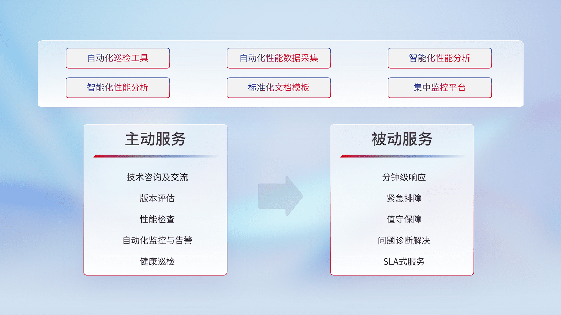 智能化工具和标准化文档,,,,保障服务质量,,,提供主动服务(包含技术咨询、、、版本评估、、、、性能检查、、自动化监控与告警、、、、健康巡检)和被动服务包含(分钟级响应、、紧急排障、、、值守保障、、问题诊断解决、、SLA服务)。。。
