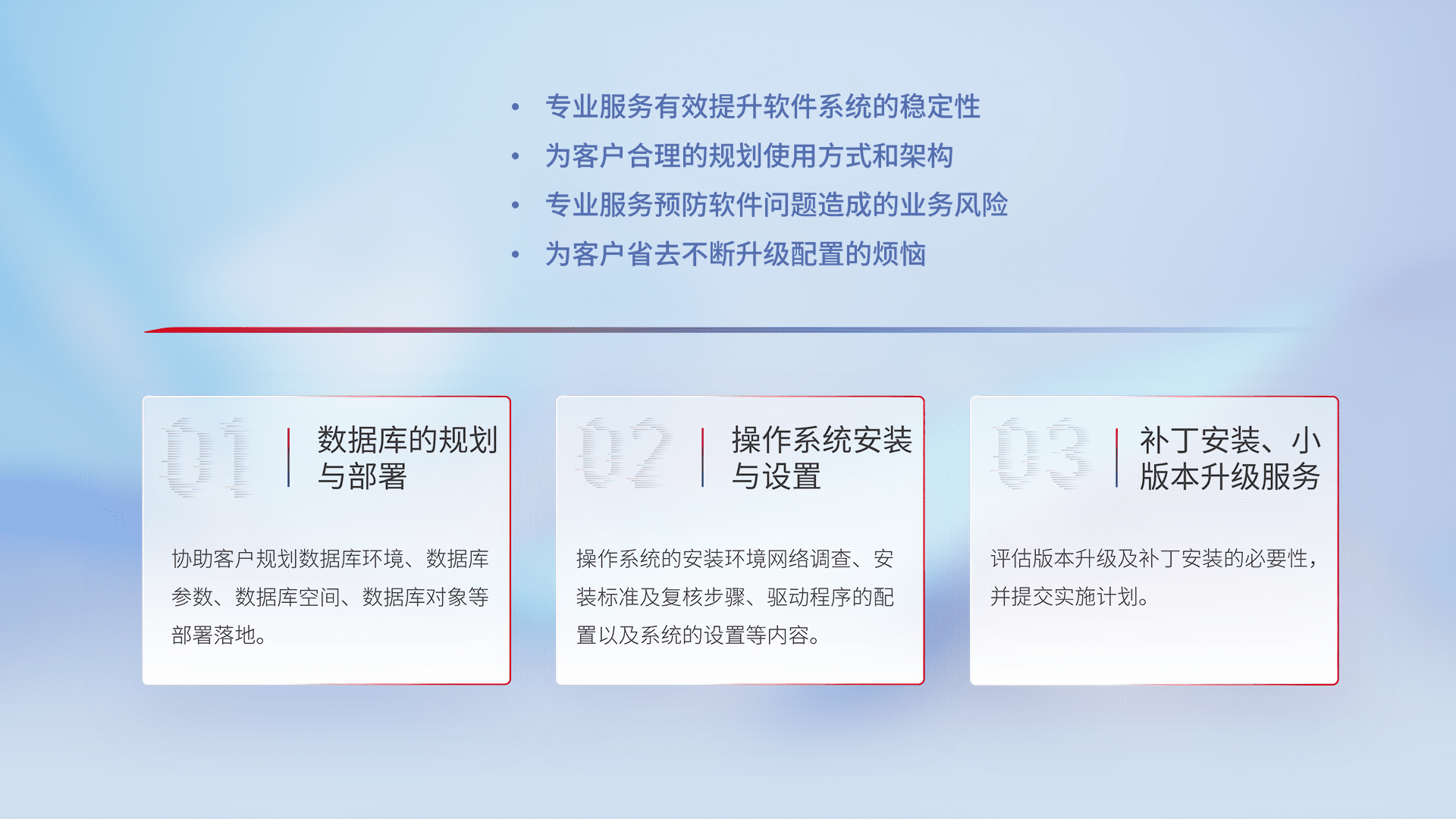 为客户提供软件规模升级、、、快速部署、、、按需配置的专业服务,,从数据库的规划与部署到操作系统的安装与设置,,,再到补丁安装和小版本升级提供支持。。。。