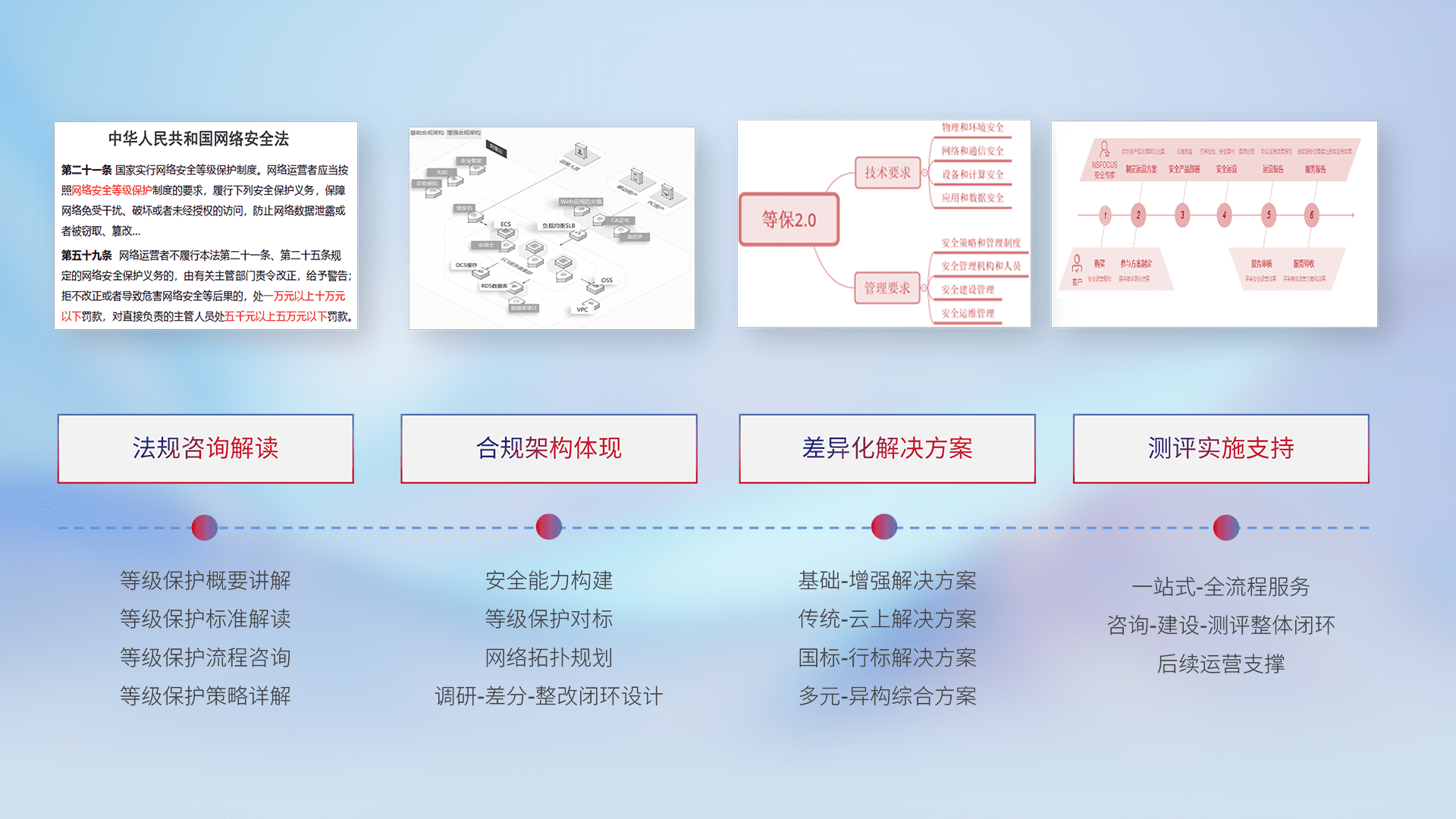 通过专业的法律咨询解读、、、合规架构体现、、、、差异化解决方案、、测试实施支持等服务,,,,为客户量身打造等保合规体系。。。
